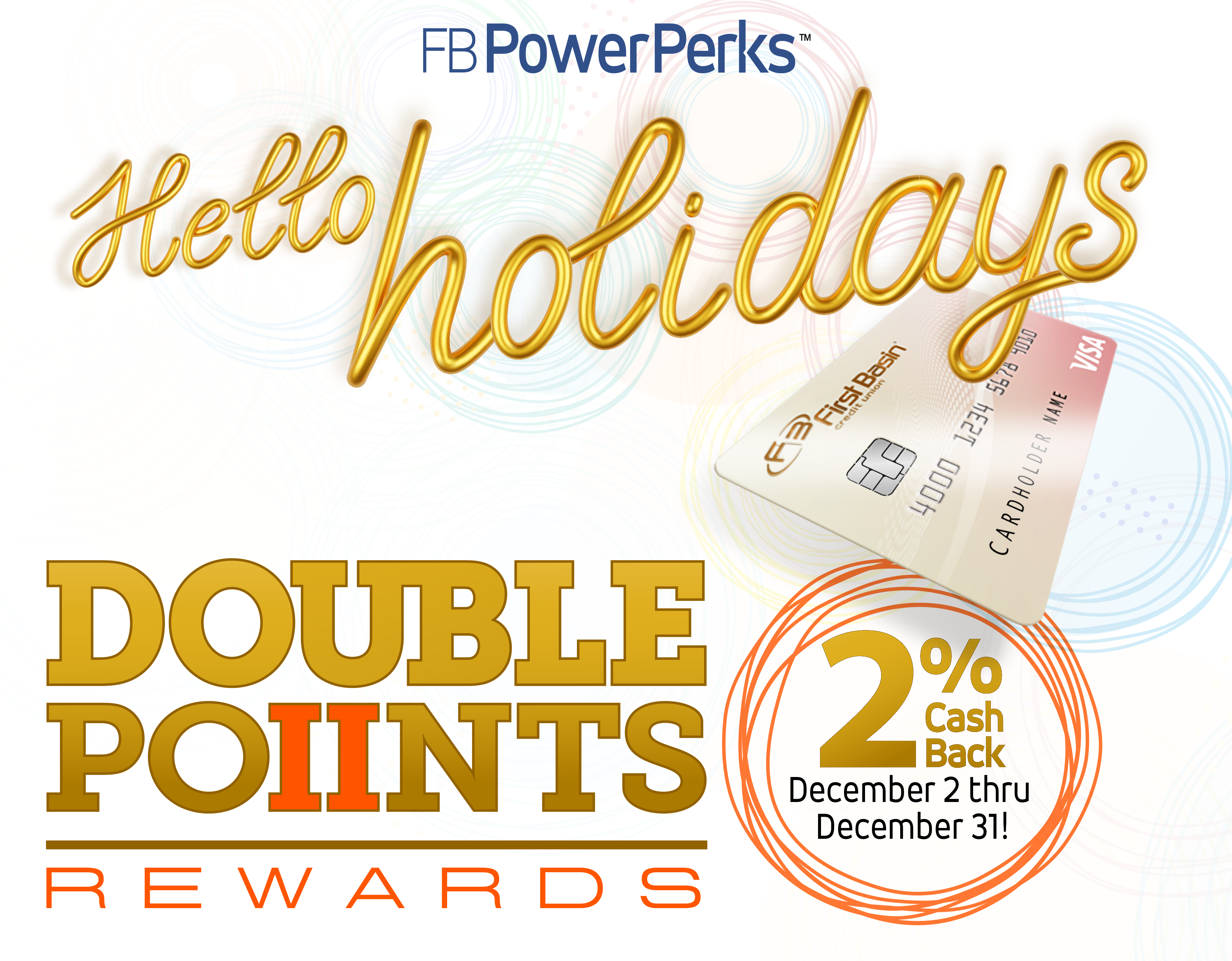 Credit Union membership required. Setup your “PowerPerks” account online at www.firstbasin.com/credit-cards. Member may only earn Double Reward Points December 2 – December 31, 2025. To apply for a First Basin Classic or Premier credit card please speak with a member representative or apply online at www.firstbasin.com. Upon approved credit.