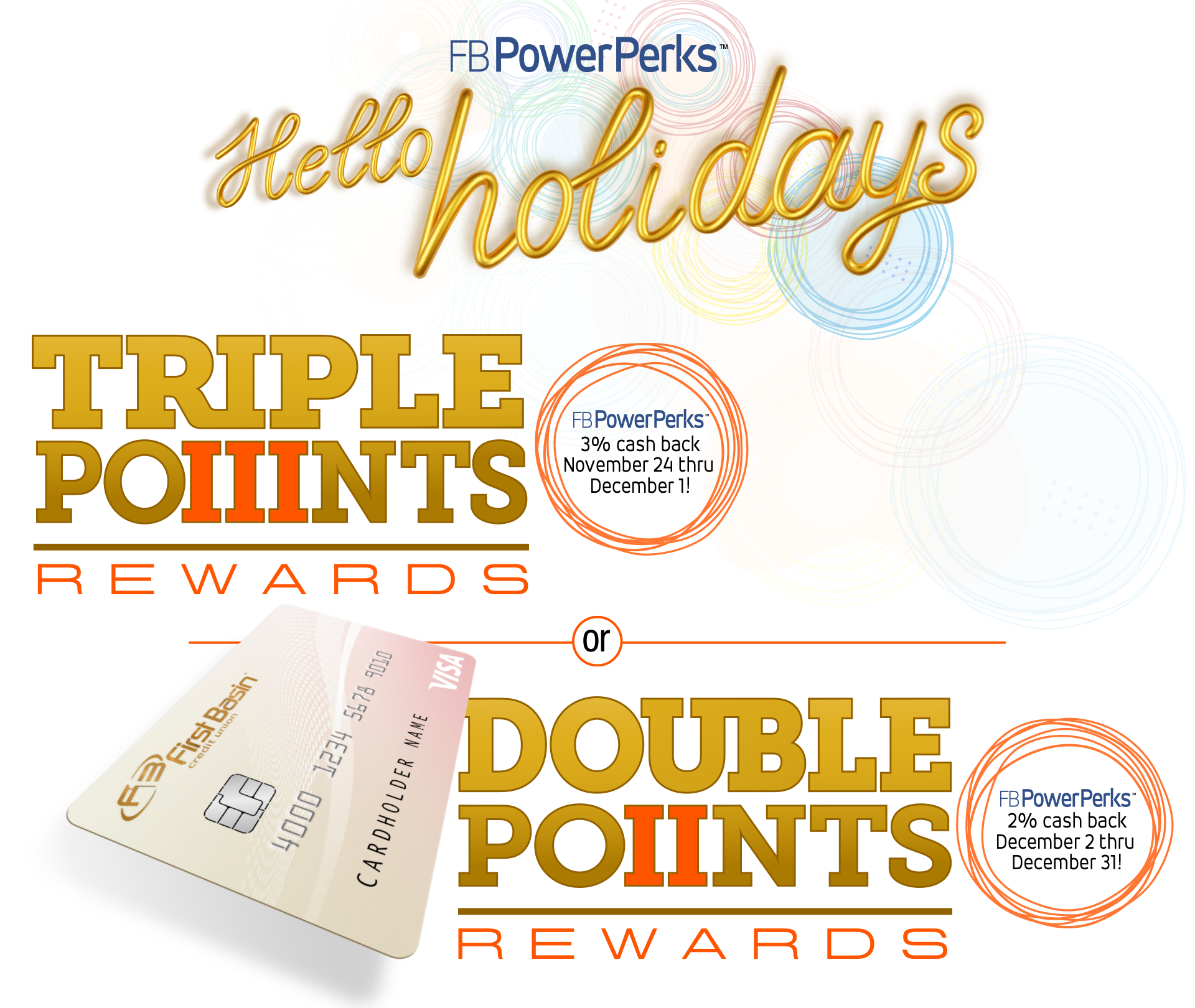 Plus, when you use a First Basin Credit Card, you'll earn 1% cash back for every dollar you spend. With FB PowerPerks, you'll earn cash with points that never expire. Cash earned can be deposited directly into your savings account, used to make a payment or we'll happily issue you a check.